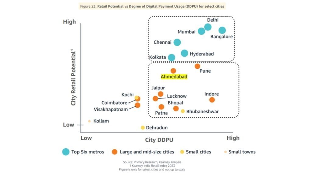 Retail Potential and Digital Payments: The city’s retail potential, as assessed by the Kearney India Retail Index, underscores its status as a promising market for digital payment growth. The city’s retail attractiveness, determined by factors such as market size, consumption indicators, and ease of doing business, complements its high degree of digital payment adoption. This synergy between retail potential and digital payments is evident in Ahmedabad’s vibrant market dynamics.