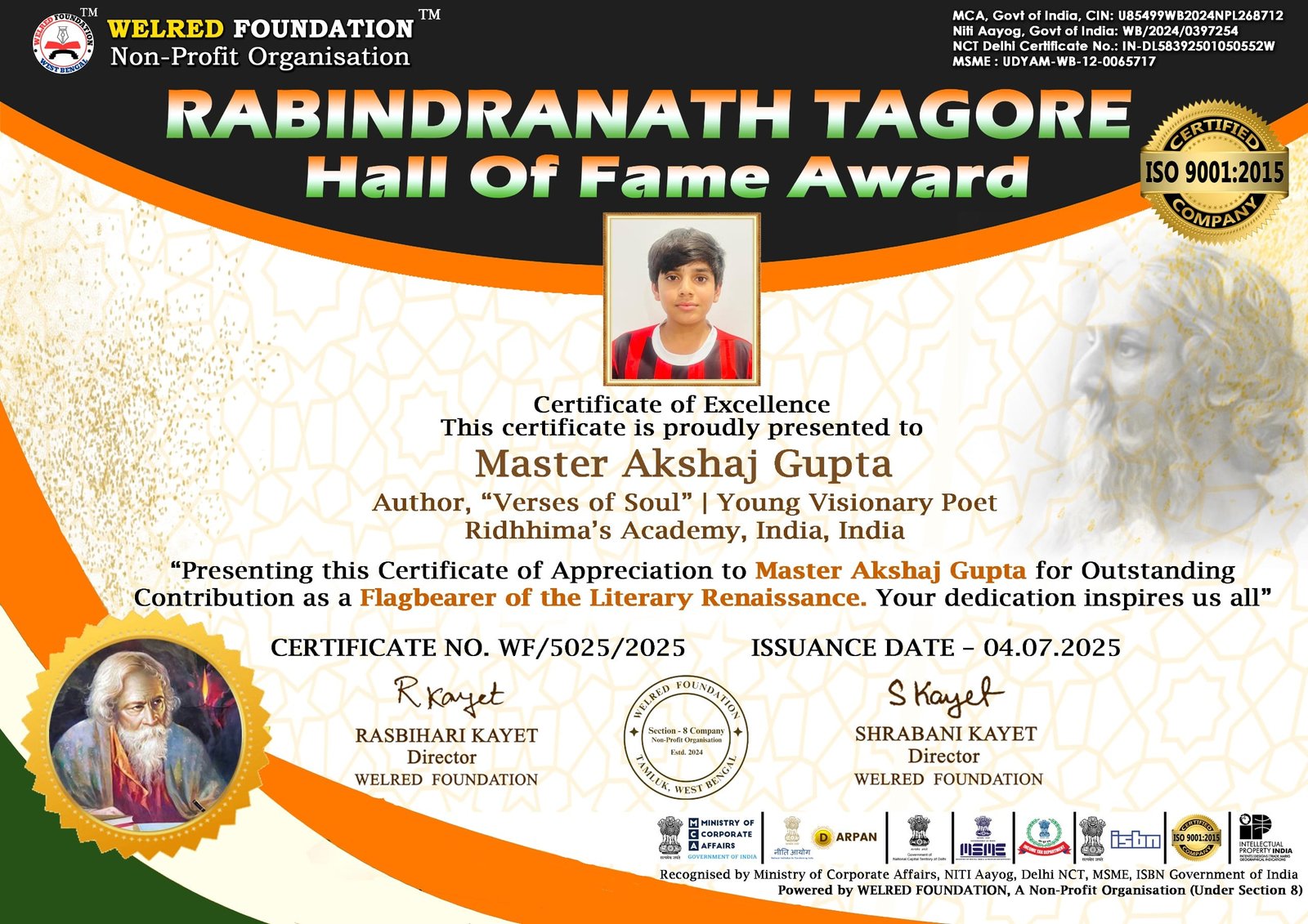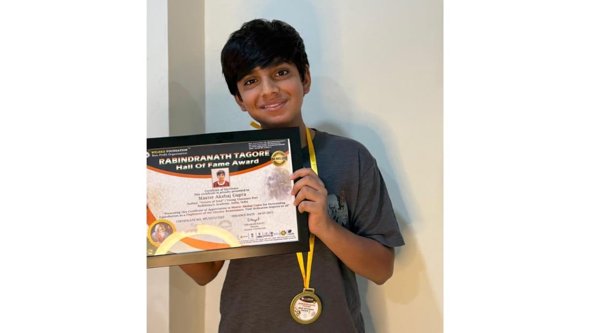 New Delhi [India], July 28: Akshaj Gupta, a prodigious 13-year-old from Ridhhima’s Academy, has been honoured with the prestigious Rabindranath Tagore Award for Outstanding Contributions as the Flagbearer of the Literary Renaissance—a national-level recognition reserved for minds that shake the system and stir the soul.